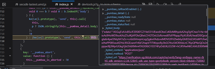 After the CAPTCHA loaded, I added a breakpoint on the mouse “click” event, but it didn’t pause execution no matter where I clicked. Next, I set a conditional XHR breakpoint on captcha/verify.